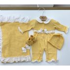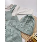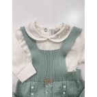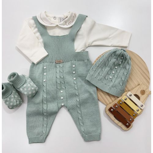 Brand: Marlú. Set nascita con salopette verde con trecce e punto smock e body con la scritta amore sul collo manica lunghe, cappello e babbucce coordinate. Colore: Verde salvia/ Vaniglia. 100% cotone. Made in Italy.