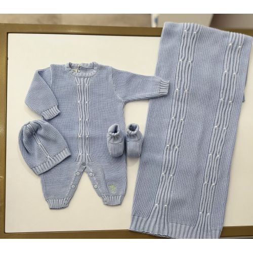 Brand: Marlú Radici. Coordinato nascita. Comprende: Tutina con punto smock, cappello, babbucce e coperta cordonate. Colore: Cielo/ Vaniglia. 50% cotone 50% Modal. Made in Italy.