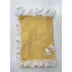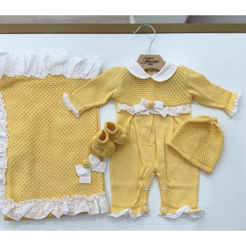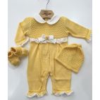 Brand: Pappa & Latte. Coordinato nascita con pizzo sangallo. Comprende: Tutina in filo di cotone, cappellino e babbucce. Colore: Giallo/Bianco. 100% cotone. Made in Italy.