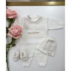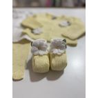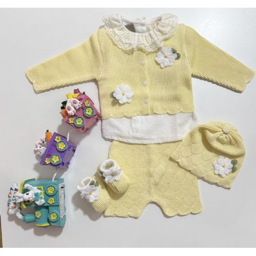 Brand: Marlú. Tema: Margherite Completino corto con camicia plumetis, cardigan, cappellino e babbucce coordinate. Colore: Bianco/Giallo. 100% cotone. Made in Italy.