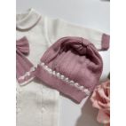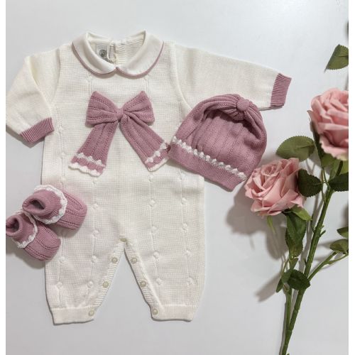Brand: Marlú. Uscita clinica con fiocco al centro. Tutina con fiocco, cappellino e babbucce. Colore:Vaniglia/Melograno. 100% cotone. Made in Italy.