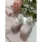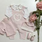 Brand: Marlú. Set nascita 5 pezzi. Salopette con fiorellini che formano un cuore al centro, body maniche lunghe con cardigan, cappellino e babbucce coordinate. Colore: Rosa cipria/bianco. 100% Cotone. Made in Italy.