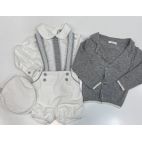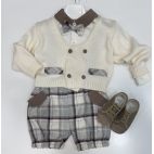 Completo elegante compreso di camicia di cotone a fantasia, pantalone modello sigaretta in tartan dai toni grigi e marrone caldo, cardigan con collo a giacca in grigio tortora, cappello e papillon in coordinato