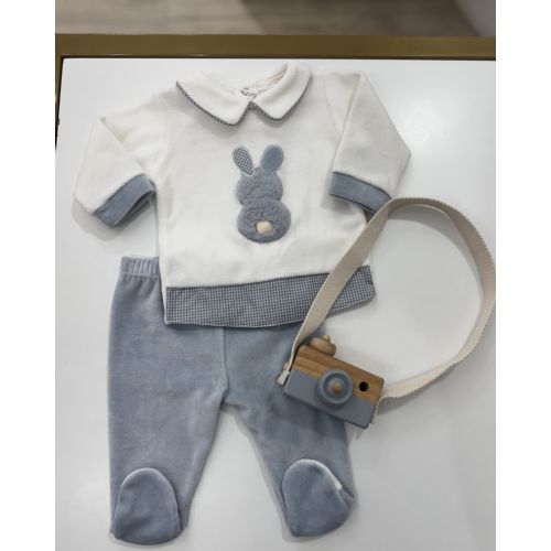 Completino: maglia con finta camicia a quadretti e coniglio 3D al centro, collo con bordino e ghettine polvere.