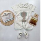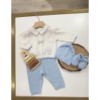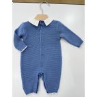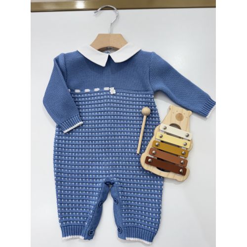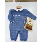 Tutina in Filo di Scozia avion e bianco con punto smock e colletto bianco in tessuto di cotone. 100% cotone. Prodotto artigianale. Made in Italy.