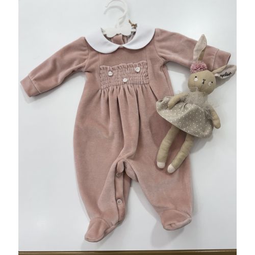 tutina in ciniglia rosa cipria, colla bianco e tre fiorellini ricamata a mano.