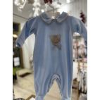 Tutina azzurra in ciniglia con orsetto al centro e piccolo fiocchetto, collo con bordino tortora. Made in Italy.