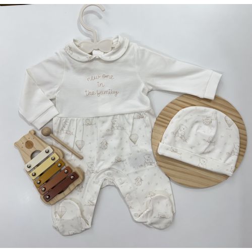 Brand: Minibanda. Tutina Unisex con escrita sul petto new one in the family. A fantasia con animale e cappellino coordinato.