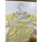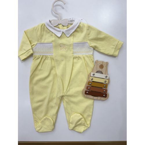 Tutina in cotone giallo con cavallino a dondolo ricamato al centro.
