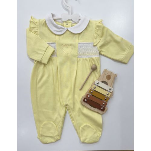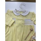Brand: Jodus fashion. Tutina con collo bianco in cotone gialla con cuore al centro e nido di Ape laterale. 100% cotone.