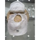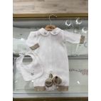 Brand: Bebè Margò. Set nascita con tutina in filo di cotone bianco e dettagli tortora, collo ricamato con cavalluccio a dondolo azzurro, cappellino, babbucce e bavetta coordinata. 100% cotone. Made in Italy.