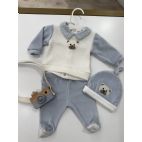 Tutina blu e panna in ciniglia con finto gilet e cappello coordinato. Made in Italy.