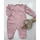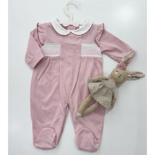Tutina rosa in cotone con cuore al centro ricamato e nido di ape laterale.