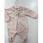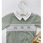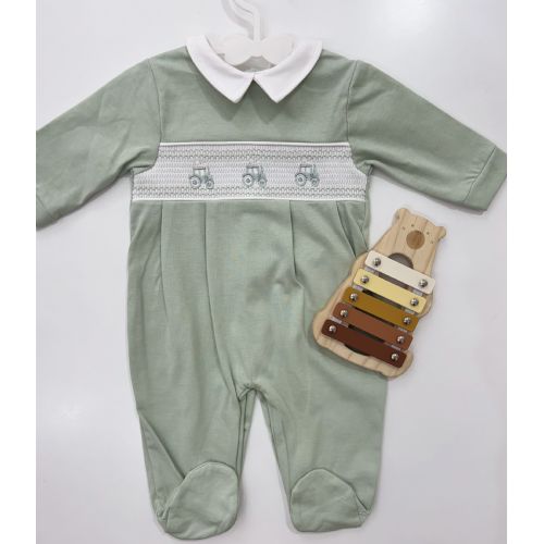 Tutina in cotone verde con trattore ricamato al centro colletto bianco.