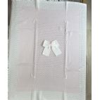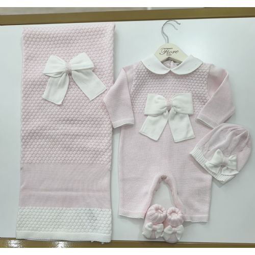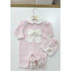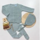 Comprende: Tutina elaborata sul petto con fiocco al centro bianco, cappello e babbucce coordinate, scialle bello elaborato con fiocco al centro e bordo bianco.