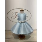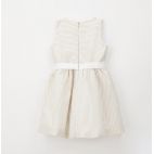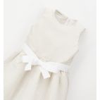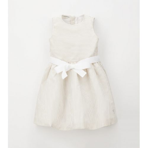 Abito per bambina Sarabanda realizzato in canvas a righe con apertura dietro con zip invisibile. Tulle nel sottogonna. Cintura in vita in gros grain. Lunghezza al ginocchio.
