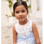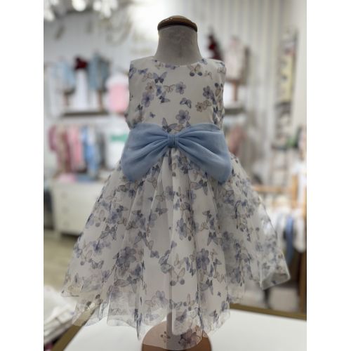 Abito smanicato per bambina Sarabanda realizzato in tulle con fanntasia all over e foderain cotone. Apertura dietro con zip invisibile.Lunghezza al ginocchio. Cintura in vita con fiocco realizzata in tulle